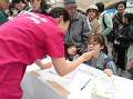 歯科衛生士科の学生は、歯科ドックコーナー「RDテスト・咬合力測定・ブラッシング圧測定・ブラッシング指導」の各ブースにて先生方のアシスタントを行いながら一緒に来場者の方々と交流を図りました。また、小学生以下の子供100名を対象に、歯科衛生士科の学生が印象を採り、歯科技工士科の学生が石膏を流して両科で協力して手型模型作りも行われました。足型を採るケースも見受けられましたが、受付開始から予約が殺到し今年も大盛況となりました。そして、今年はステージで行われた「歯と口の健康クイズ」にも参加させていただき、3名の学生が、緊張しながらも先生方のアシスタントとして“さっしぃ”と一緒に会場を盛り上げていました。